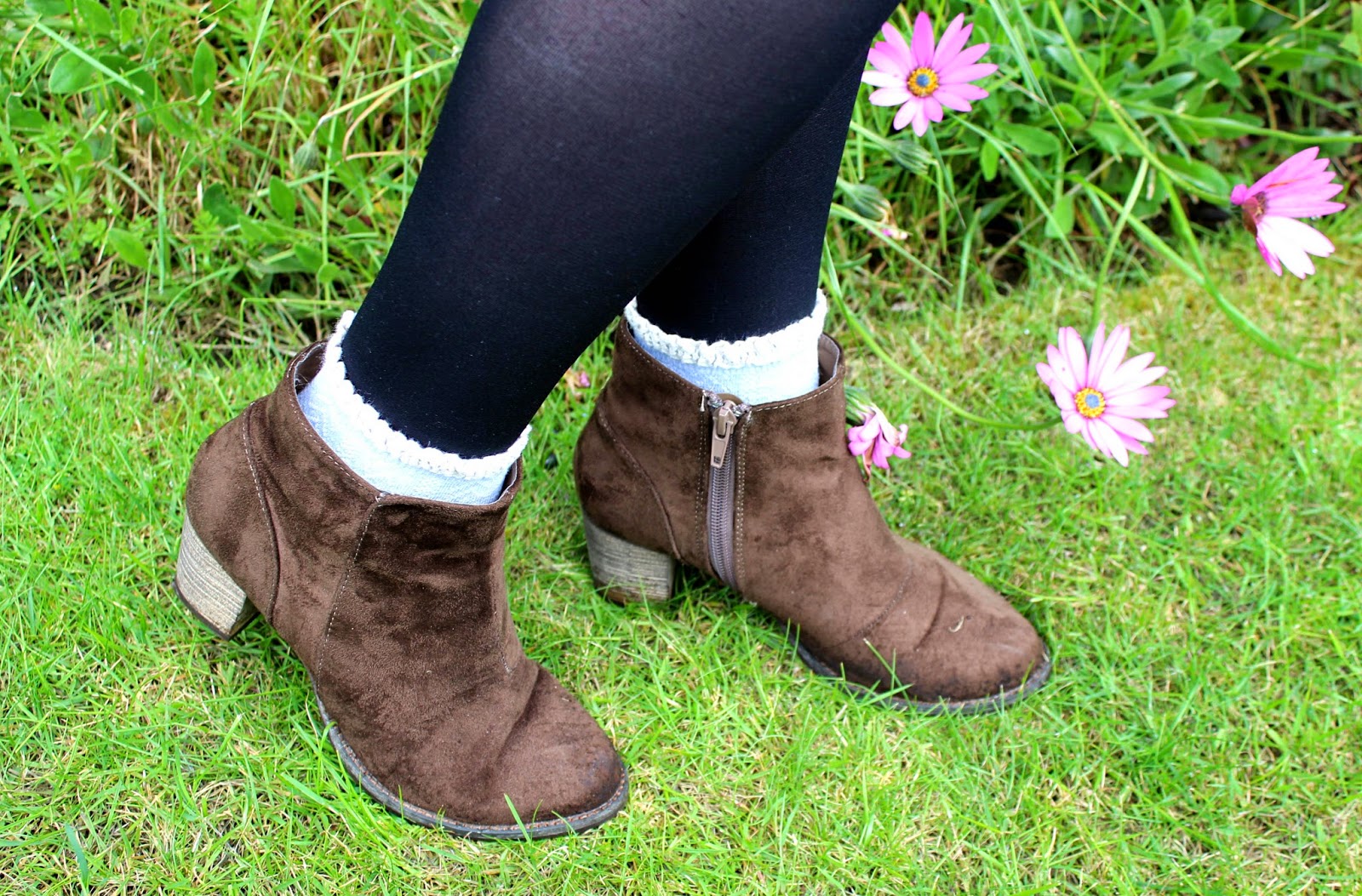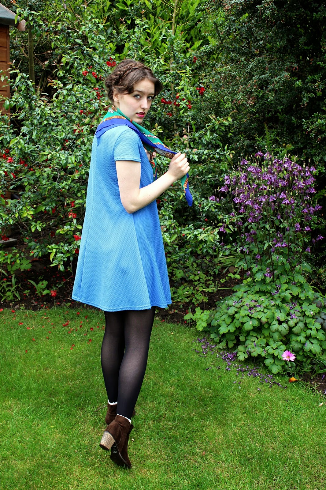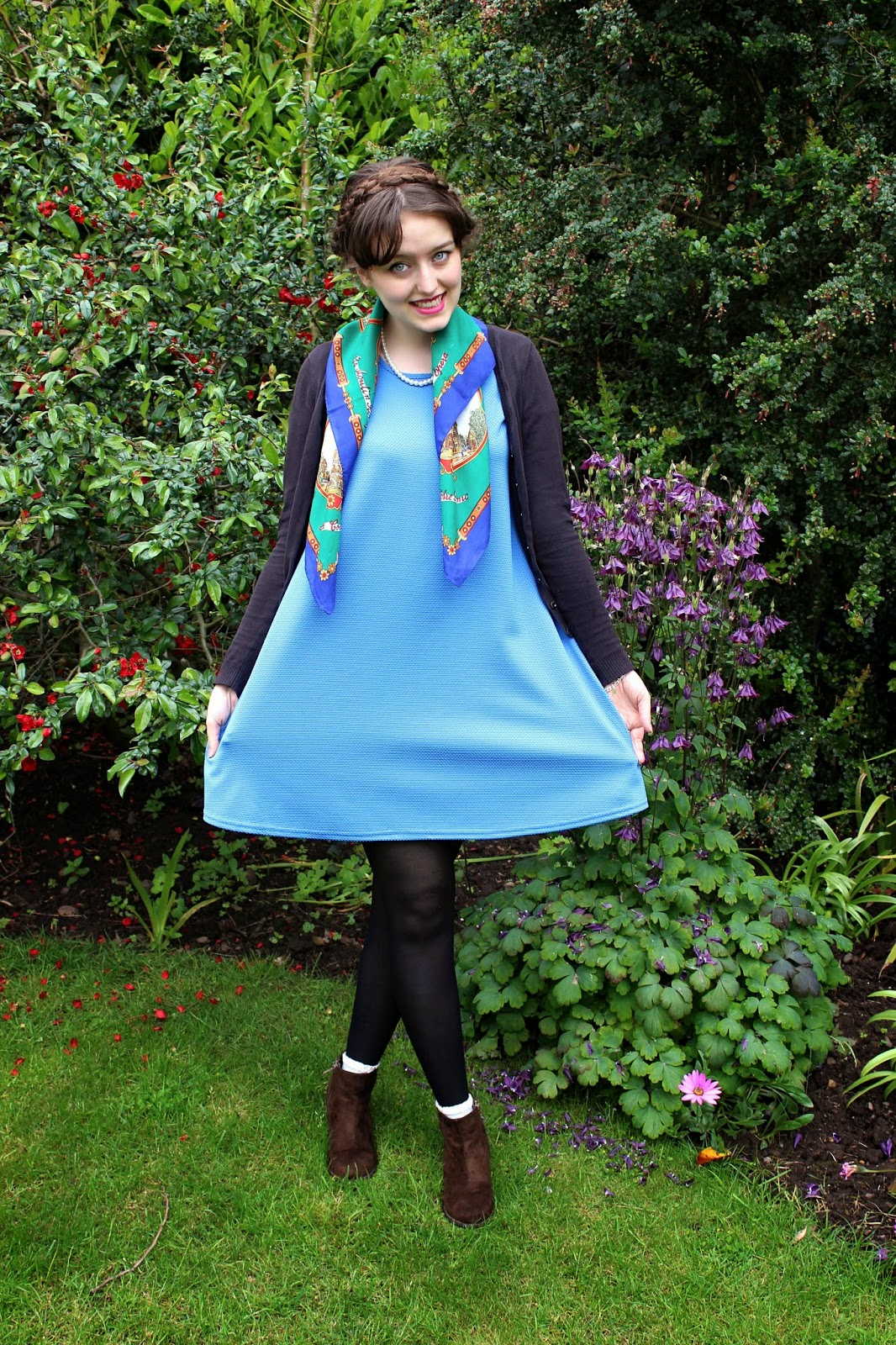 This is a new dress from my Primark haul, it’s a lovely textured swing dress. I don’t normally go for pieces like this that have a baggier shape to them. I think they tend to drown me, but because this dress is short it is smaller and therefore appears less frumpy on me. I wore it with a classy square scarf I got from a Vintage shop a year ago. I was interviewing the lady working there, for a Uni proj, and she thought me and my friend were so lovely she let us pick up a scarf for free. Yay! I love the combination of colours and the design includes a big Eiffle Tower. I previously wore Heidi Braids when I was interning at The Sunday Time Style Magazine in this post, but here I decided to wear a centre parting with the plaits. However, I think I just need to get over the fact centre partings are really not my thing!
