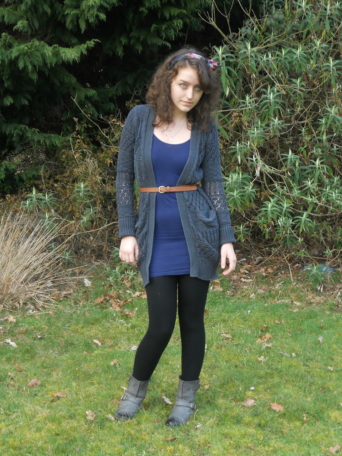 The basic outfit is a blue bodycon dress and leggings. I have added a chunky knit cardigan over the top and belted it around my waist. On my figure, this emphasises my waist and gives the effect of having some sort of booty! I’ve had compliments all day about the cardigan and my hair bow. I think that the bow adds a vintage look, a slight 50’s edge. I love the 50’s hair and make-up!