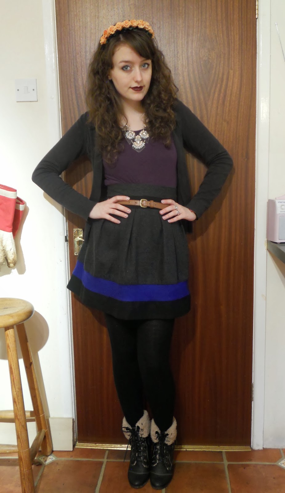 I usually like to have like a finale outfit like in the summer, when I wore this bobby dazzler on the last day of term. However, here I’m not sure the whole ensemble has as much pizazz as I’d usually work towards. Here I was more trying to get a look to work with the wow-eey shoes. I’ve got my new necklace on and worked the purple top to compliment with that. The skirt has a lovely charcoal grey and blue blocked colour pallet which I teamed with black tights so the blue stays so vivid and works well with the purple up top. I thought the colouring was very dark, for a typical Row Bow look, and extremely wintery so I places my orange Prairie Charms Floral Headband. The addition of the tan belt give another tonal link, so neither the headband or bel appear out of place.