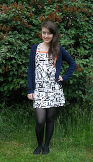 This dress is another piece from my New Look order a couple of weeks ago. It is a letter print pinafore. I love it and think it’s super cute. There’s one 10 year old who always likes what I wear and I think she wear some pretty fetch things to. The best thing is she gets the older children’s clothes which mean I can pick them up for me too, Yay! I know for a fact we have at least on of the same dress (this one). She said she liked this one too, as did several other people. Here I have worn it with one of the little tops my sisters got me for my birthday. They said it was to match my paler orange lipstick. I liked that I could wear the cropped top and still show skin without flashing the tum. The low dips at the side of the dress allow for side-waist to be flashed. Sexy, hehe! Since I was flashing the flesh I covered up with some black tights and dollie shoes. I couldn’t really wear silly shoes because I’d be running around the theatre for the duration of each show. Great Exercise!