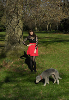 The black lace top is actually a dress which was too big when I was originally given it. But now I appear to have grown and it’s turned into a bit of a bum-skimmer. Although I did have my black thermal underneath, so maybs it would sit better without that. The skirt was originally part of a dress, but for my most recent art project I took the top and bottom half of the dress apart. It was a size 12, so it was just the right bagginess to paper bag waist it with a medium sized tan belt. I adore the necklace. It’s a golden spiked necklace with red wooden beads around the back. That was a charity shop find, initially for the art project but I love it so much I’m keeping it for me! I think it was like £2-£3 so total barg! Black tights and dollies shoes were simple additions to the look so the red skirt stands out and makes for a more dramatic look. But tan tights would make it lighter for a summer look.