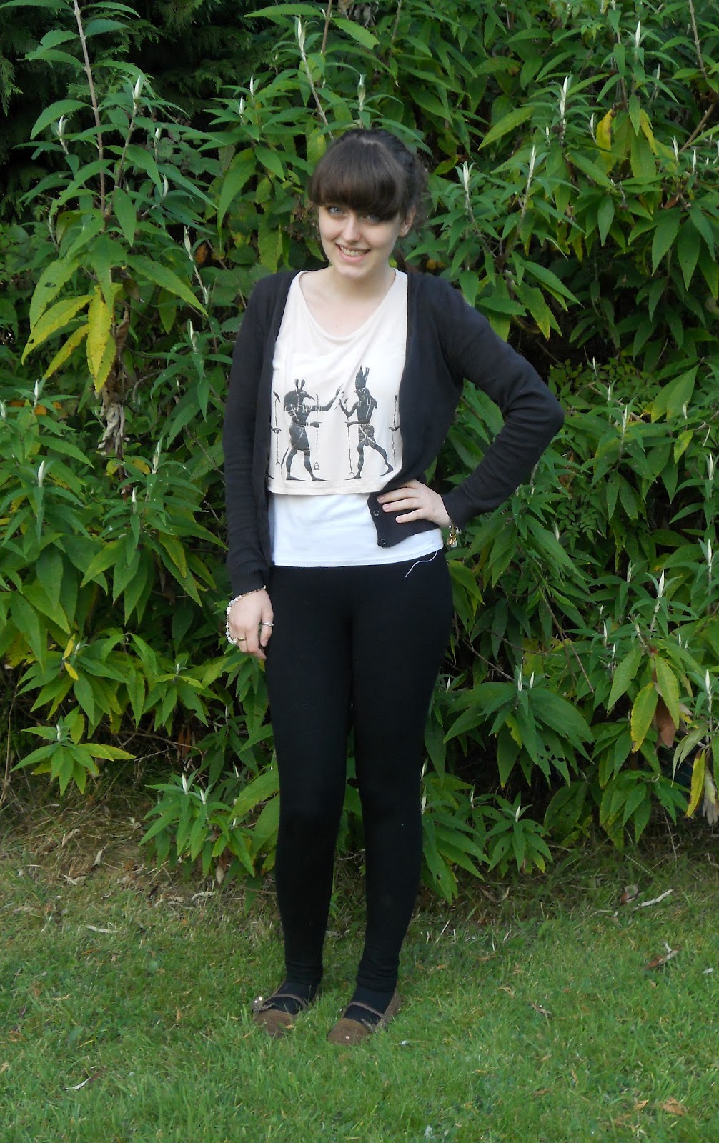 I really like this top, but I don’t find that I really have a lot that goes with it. As it’s a cropped top, I wear a white vest top underneath as, 1) I’m not confident in flaunting my tum and 2) It’s Autumn/Winter and really not the right temperature to be flaunting a lot tbh! Any other pale top would work well underneath too, depending on what else you choose to team the cropped top with. This one is a pale salmon colour so maybe even a duck egg blue top would work. I like the cut away shoulder detail and the edge of the sleeves are decorated with little sparkly gemstones. This is one of my few tops with a graphic design on and as the design is black, this is the colour I based the rest of my outfit on. I chose a black cardigan and black leggings (with black tights on underneath, natch!). I was toying with the idea of wearing a pair of tan/tobacco coloured chinos instead of leggings, which would have worked just as well too.