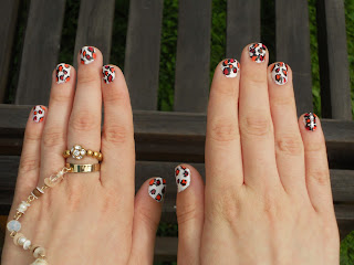 I started by applying the white as a background colour. Then I painted lots of red and orange dots randomly across the nails. I usually use my liquid eye liner to create rough outlines around the colourful dots. But as my eye liner is just a cheapo Primark one, which has a stiff brush, it has begun to split. This means I can no longer draw neat circles around the dots, but now a scratchy effect it created. The piccy below show what I mean. I also found that the liquid was kind of repelling on top of the nail varnish, which left edges that look fluffy and fuzzy. I think that the outlines now look like when somebody has sketched something and it’s a little scribbley. My left hand looks better as I feel the right had is a little crowded and the outlines are thicker and less sketchy-like. It makes it look more messy and doesn’t cover up the fact I didn’t mean to do it like that as well!