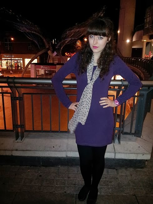 I decided to wear this pretty purple dress because it was long sleeved and it was a wee bit chilly recently. Not sure if you noticed that St. Jude storm shenanigans that flew past, but that was the weekend after this so it was a little breezy to say the least. (Oooh-Err! Look at Row Bow getting in a little current affairs into her blog post) To contrast the deep purple of the dress I added a long cat-print scarf which I never get to whip out! It sits really nicely with the pearl necklace I wore underneath. Natch I had my tights and leggings combo to keep me toasty, but I wore this with little black dolly shoes. As soon as I got on the tube I was really wishing I’d worn my long brown boots as they would have gone so nicely with my brown aviator coat, but maybs next time. Signature Row Bow Bright Pink lippy and Woo-Hoo ready to soc-al-ise!