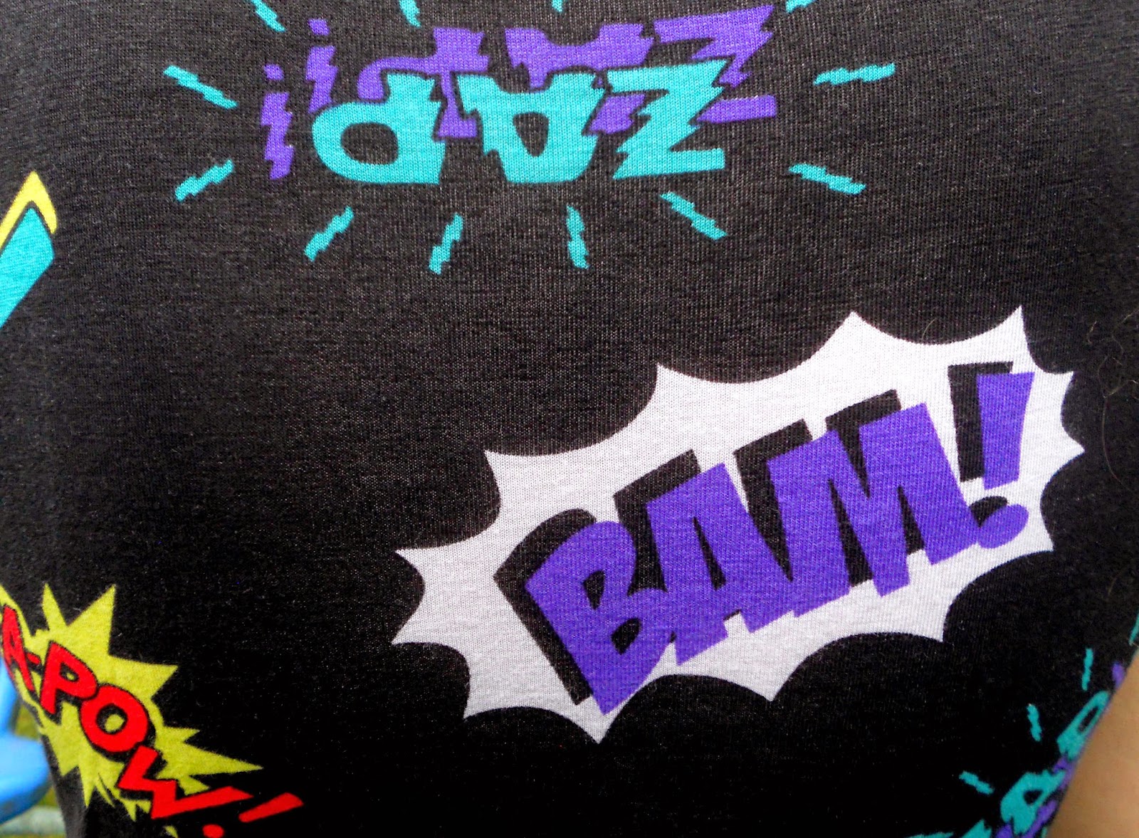 This floor length gypsy skirt is perfectly sensible for working at a primary school since there’s no chance of flashing in it whatsoever. That basically makes me invincible within the school grounds, hehe! I didn’t know what to put the skirt with because I’ve only worn it with a crop top before (see here) and a longer top didn’t sit right and left the waist all crinkly when tucked in. So I worked around this issue but grabbing my longest crop top and just managed to tuck it into the wide elasticated waistband of the skirt. Although I did have to be careful not to expose myself from the waist this time, I think the two pieces work well together as the overall black bodycon shape is quite slimming. The bursts of colour from the action speech bubbles are a fun was to life the pallet.