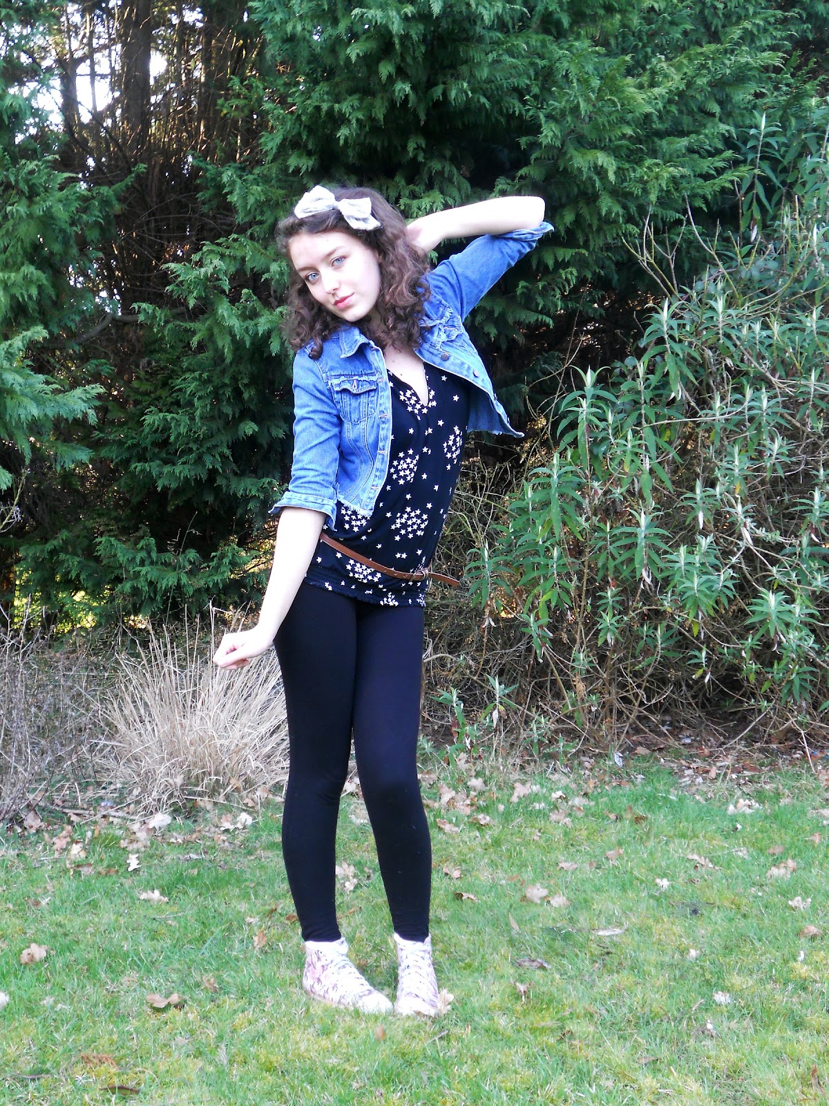 It’s casual wear really as it’s a relaxed environment at the drama group. I based my outfit around the leggings as it is essential I can move easily- especially with the little ones! I chose a patterned star print top, which is looser than the leggings and make the look more casual. I wrapped a thin brown belt around my hips to create a break between the block of black. I added a cropped denim jacked and chose a lacy bow to wear in my hair. The combination of the denim jacket and bow reminds me of the 1950’s which I love. The pink trainers stand out against the rest of the colour scheme, but not too much.
