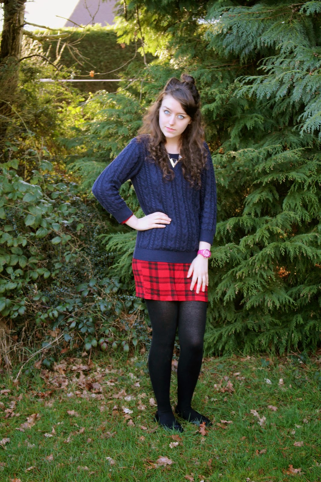 I wore this look on a casual day at uni and I think it would also be perfect for college or even a cool and caj non-school uniform day. I think that the dark pallet allows the vivid red tartan band to really become the pizzazz of the ensemble. Combining the texture of the jumper with the print of the tartan makes for a really interesting mix. They aren’t too different as they both repeat a vertical line pattern.