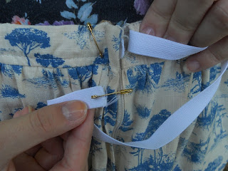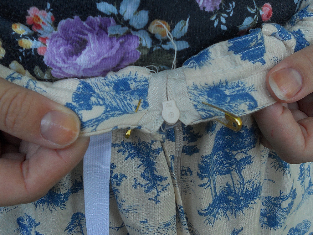 The skirt original was faaaarr too big for me, as you can see. The pattern of the skirt was a very simple tube style with marginal gathering to add a little shape to the piece. The waist band is just an inch of extra material folded in half and wrapped around the top of the skirt. I decided to insert a piece of elastic the length of my own waist through the existing waistband on the skirt. To do this I unpicked the stitching either side of the zip and attached a large safety pin to the end of the elastic. This makes it easier to thread through the fabric waistband as you can feel it and pull it along. You can see the elastic I used was about ¾ of the width of the existing waist band. Any bigger and it wouldn’t have gone through flat. Or any smaller and the elastic would break down quicker with wear.